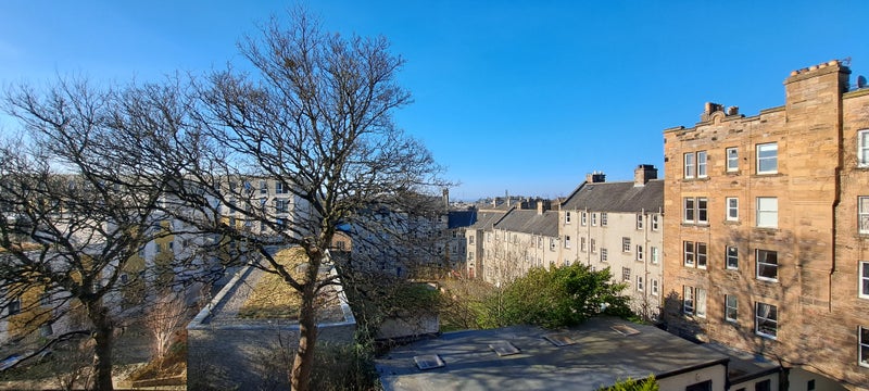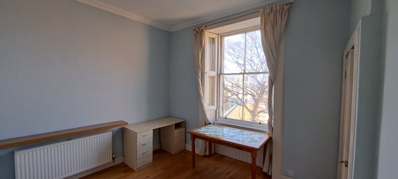 Unfurnished room in a 19th-century stone-built tenement flat in Newington between Holyrood Park and the Meadows. Large sash window, northern aspect, view over back garden towards Calton Hill. Bathroom and modern kitchen shared with male postgraduate student. Rent £700 per month, bills additional (fibre broadband, water, gas, electricity), council tax band D.