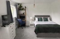 We're offering a recently decorated double room for rent in our home. This room features ample natural light from 2 windows, a spacious cupboard with a hanging rail, a double bed, desk, TV and a chest of drawers.