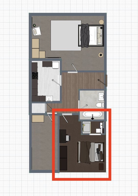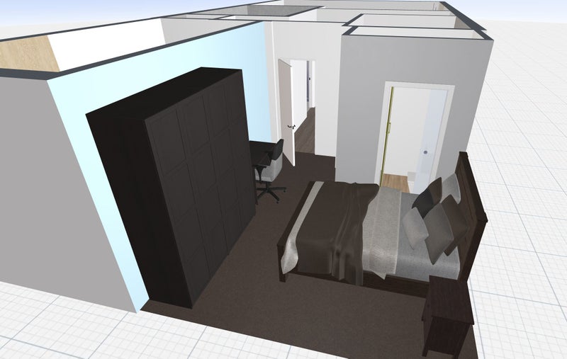 Generous king-size double with a desk, chair, and wardrobe, plus your own private ensuite bathroom currently being finished to a high spec. Photos show the room empty ahead of furnishing - a furnished floor plan and 3D render are included to give a clear picture of the final layout and feel. The rest of the flat is already in great shape.