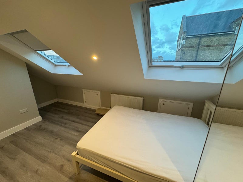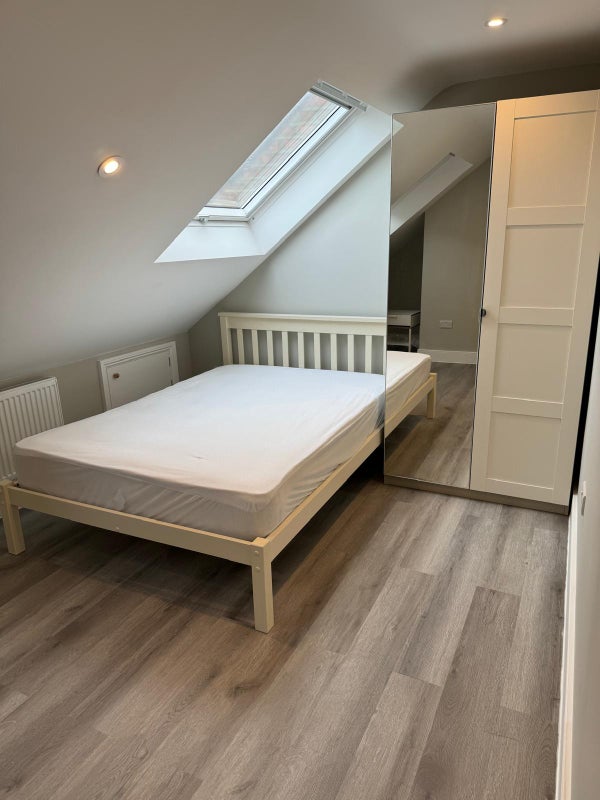 This fully furnished top-floor front room is located at the front of the house and feels very private. It features charming sloping ceilings and two windows that flood the space with natural light. The room comes with a comfortable double bed and a wardrobe, making it a cosy and bright retreat. ☀️