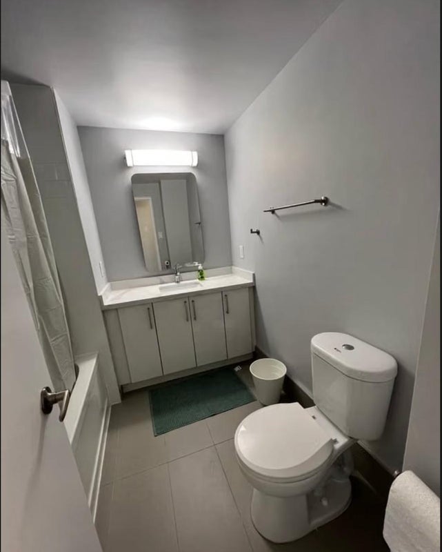 The bathroom is shared between three bedrooms, one of which is occupied by a female tenant who works and studies.