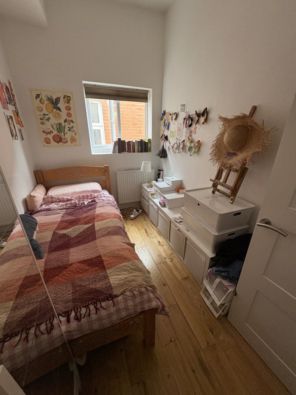 Smaller bedroom: We swapped around the office and the smaller bedroom, so the new tenant can take their pick of which room would be theirs. 1 double bed (we are swapping out the single for a double), wardrobe, side table, mirror