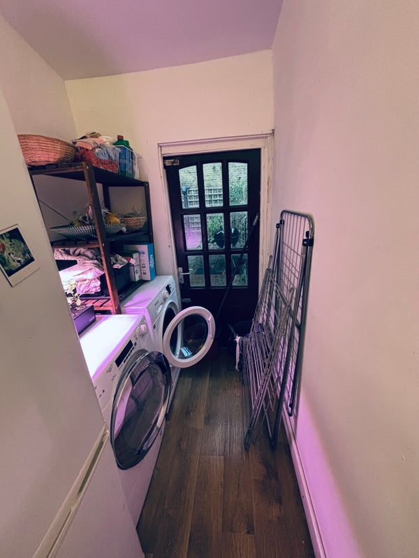 We have a dining room, a living room, a kitchen, a utility room with a washer and a dryer, a small bathroom, and a separate toilet. We also have a little garden where we grow a few things and have wonderful BBQs in the summer. The flat has a loft for storage and a small shed where you could keep a bike!