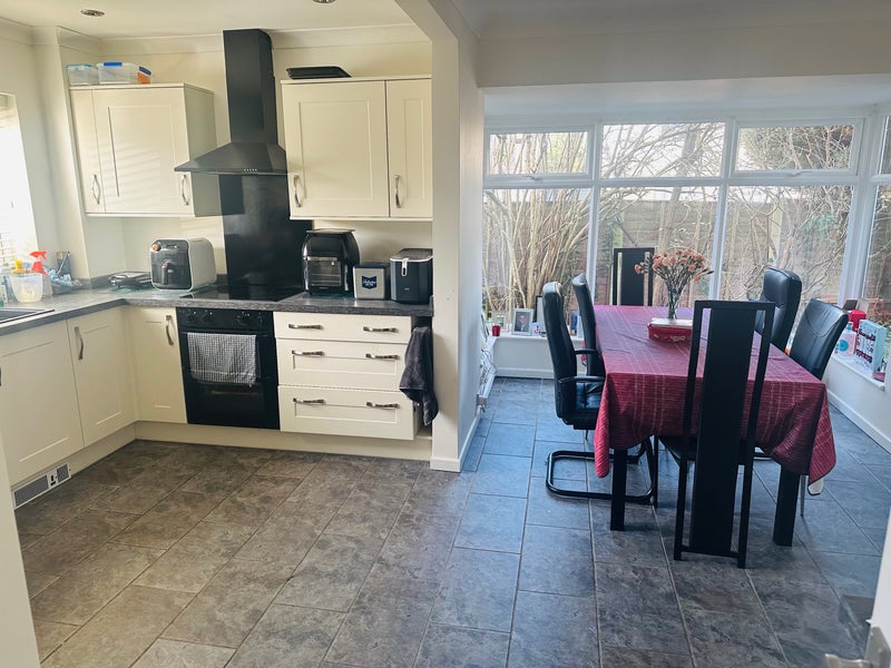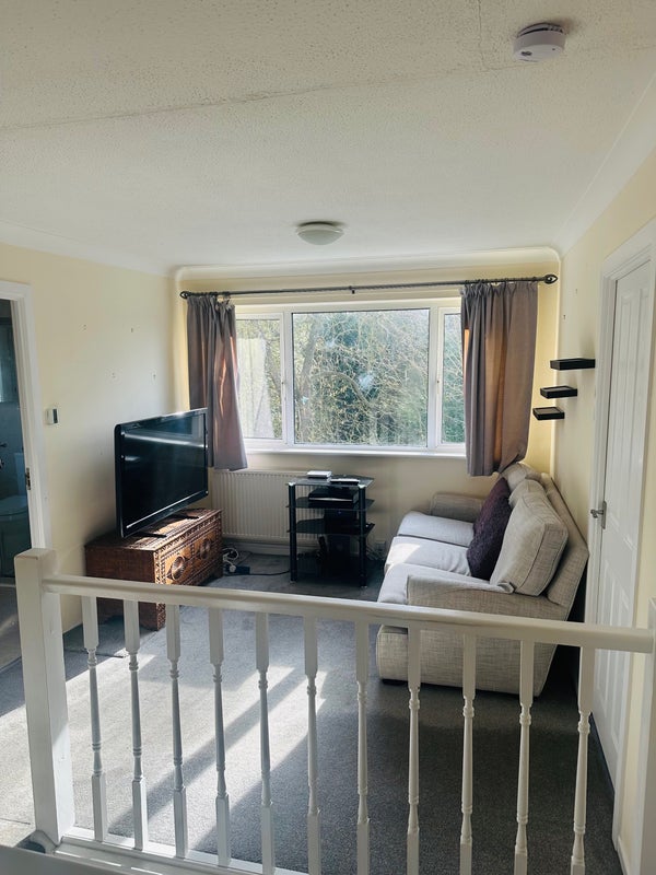 Leading to a common large bathroom (99% of the time sole use)with shower and bath and heated floor and heated towel railing. . Access to a large lounge and 65” tv , large open plan kitchen with dishwasher .Own separate fridge.. Average size well kept garden and deck with two gas BBQs .off road parking for two cars besides the Landlords car. Laundry room with washing machine and dryer .guest toilet downstairs. 150 yards to nearest Rail station on the Cambridge/London line. Rail 15 minutes to Cambridge and 1hr15 min to London .
