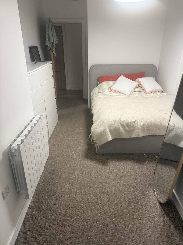 The room is bright and well-sized, suitable for a double bed and additional furniture. It currently includes a bed frame and some hanging rails for storage. Please note that a mattress and chest of drawers will likely be required upon moving in, allowing you to personalise the space to your own needs.