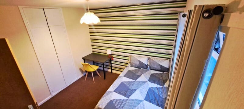 Your room is beautiful and fully furnished, featuring a double bed, wardrobe, desk, and chair.