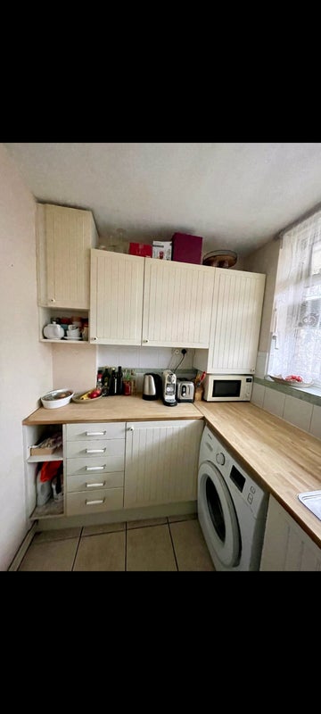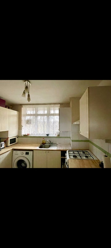 Fully equipped kitchen with new appliances- fridge/freezer, microwave, washing machine, hob.