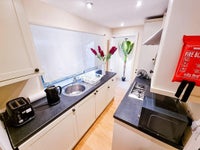 The fully fitted kitchen has laminate flooring and comes with ample storage. You’ll find an integrated oven and hob with extractor hood. There’s also a fridge freezer and washing machine. And, as you would expect, a microwave, toaster, kettle and utensils come as standard.