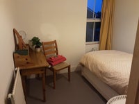 First floor room (2.7 x 3 metres) with SINGLE bed for single occupation (unless otherwise arranged) with blind and curtains, wood effect floor, and comfortable mattress with linen provided if necessary. A desk, chair, shelves, hanging rail for clothes, lamp and bookcase are also in the room.