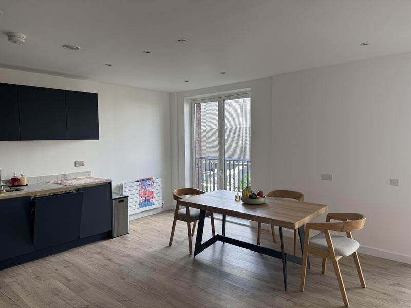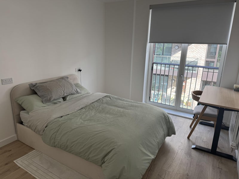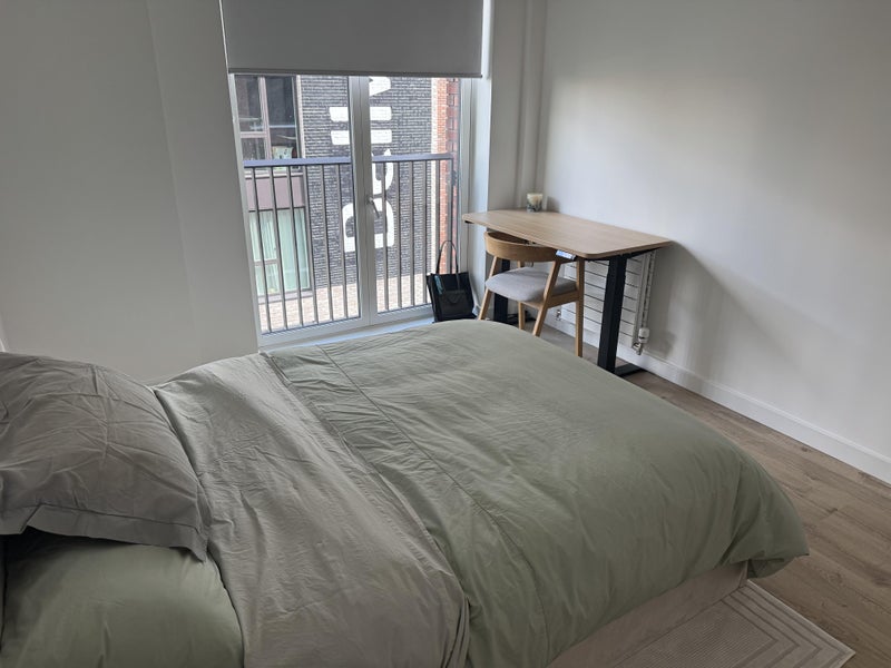 A bright double bedroom for single occupancy is available in a modern flat located on Pudding Mill Lane, on the 3rd floor with lift access.