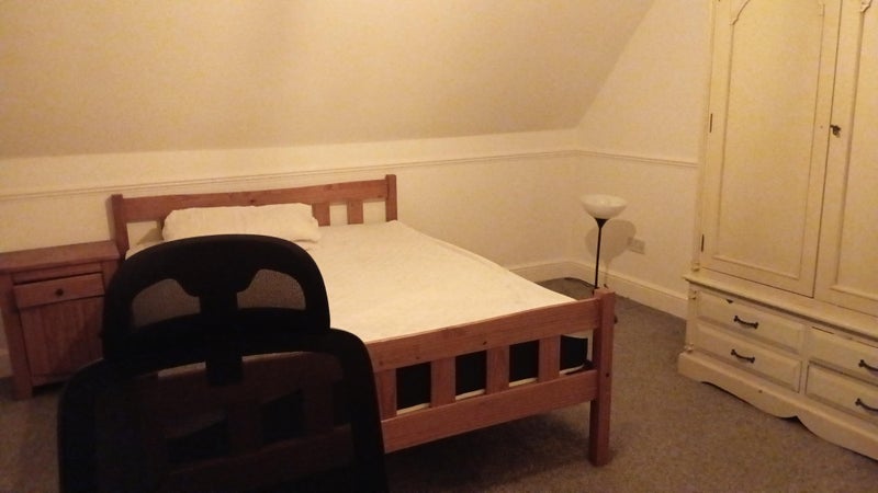 Nice bright warm double room with king size bed, wardrobe, chest of drawers and desk. BIlls included - excluding share of superfast broadband (currently 27.99 pcm) and council tax.