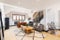 Original windows are retained in the living space. Exposed brickwork wall and stairs lead to the mezzanine level, a bedroom enclosed by glass panelling.