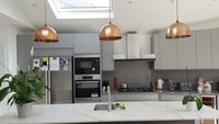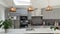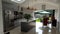 The kitchen is a contemporary kitchen with living area furnished with TV and comfy sofas.