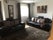 Moving Into the front room there’s two large leather sofas and 60” TV two table stools and sidelamps.