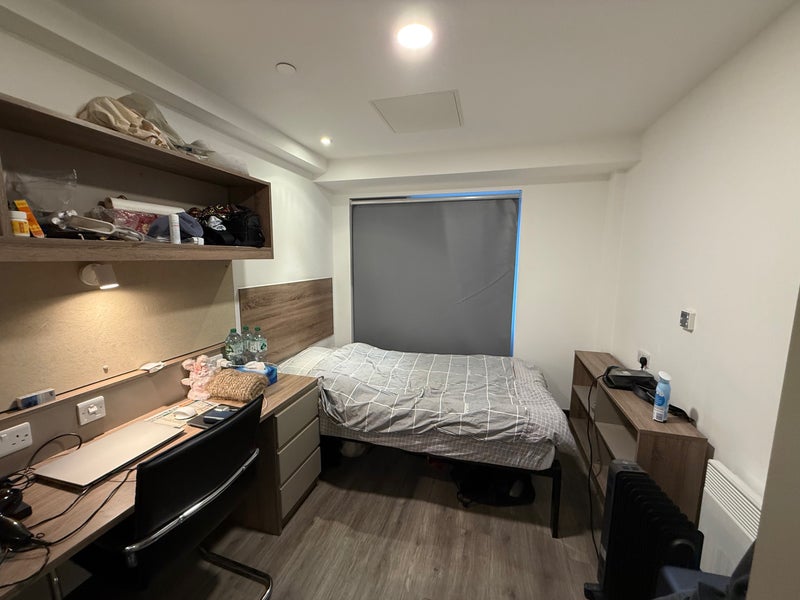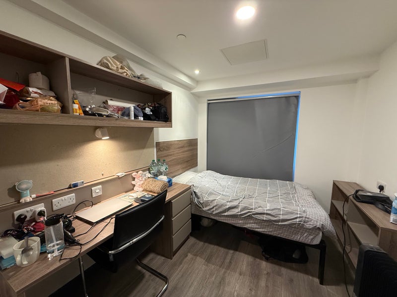 • Fully furnished: small double bed, desk, chair, wardrobe, storage