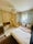 The room is bright and modern, featuring a comfortable double bed, workspace desk, wardrobe storage, and warm decorative lighting, creating a cosy and relaxing atmosphere.