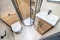 With sandstone effect tiling throughout and wood effect tiles as the background tot eh black accented shower cubicle with black rainfall shower head and detachable hose, the space has a warm feel ready for those annoying early mornings!
