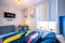 The bed itself is a midnight navy upholstered double bed with memory foam mattress, perfect for getting the best nights sleep, and with eh window to the left hand side you have plenty of natural light!