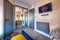 As you enter on the left hand side you will have your workstation. This is a large industrial style wood desk with extra shelving on the right hand side and we have of course provided a touch sensitive gold caged industrial lamp with extra charging ports so that you don’t have to sacrifice any socket space! We have even built an ethernet port behind the desk too so you always have the option to hardwire, but with virgin business wifi you wont ever need too!