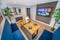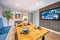 This stunning Space has an over 70” smart TV built into the wall just in front of the stunning bespoke Navy quilted seating bench and dining table, and with built in plug sockets, this area is not only the perfect place for movie night, but also a perfect alternative workspace if you want a change of scenery.