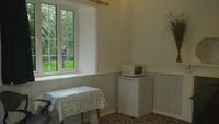 Double aspect room with lovely views of the garden, built in computer desk, and a fridge for your own use. Downstairs toilet and sink next door, shared shower with one other upstairs.