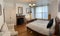 The en-suite is floored with black and white chequered flooring and includes electric power shower, sink and w/c. The bed is displayed with brand-new bed linen, pillows and a duvet, and the room is completed with matching furniture including: two double wardrobes, computer desk, chest of drawers, Ottoman chest, bookcase and twin bedside tables and the walls are also adorned with framed pictures, and there are other stylish trinkets located around the room.