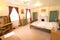 A very large and adaptable fully furnished, ground-floor, larger than king size bedroom, which includes a separate living area with sofa and a dining table, with the attached king sized bedroom having a modern fire and marble surround and a great amount of floor space.