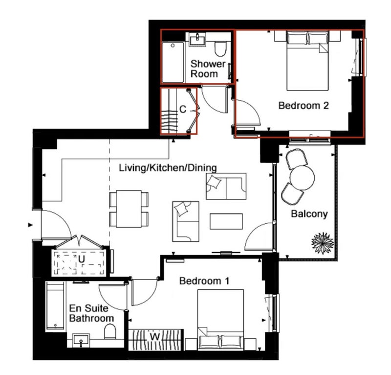 Tenant will enjoy a furnished double room (king size bed) with plenty of storage space and a TV in the room and will have exclusive access to 1 of 2 bathrooms. See floor plan with tenant's exclusive rooms marked in red.