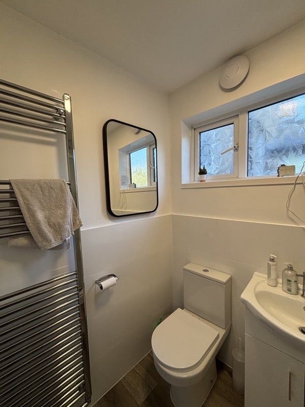 Big living room, separate kitchen, 2 bathrooms (all shared spaces) and room for a bike outside.