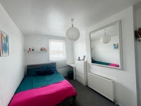 This is a large double bedroom with an ensuite. The small dresser in the photo has been replaced with a large white 2 door wardrobe with hanging rail storage, and two large drawers.