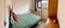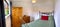 Double room is furnished with bed, chest of drawers & shelving