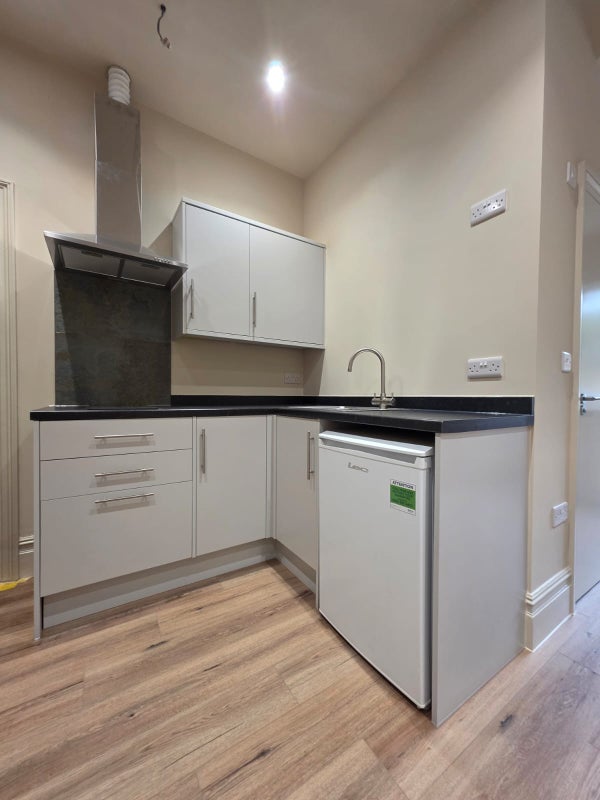 • Small kitchenette with hob, fridge, work surfaces & cupboards