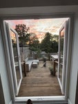 The house is at the end of a quiet street and gets lots of natural light. The kitchen and dining area open onto a large deck and garden backing onto woodland and a small stream. One end of the road is a dead end, so there’s no through traffic. It’s also where you can join the woodland walk. The deck gets full sun in summer and is a great spot in the evenings.