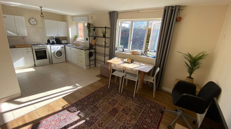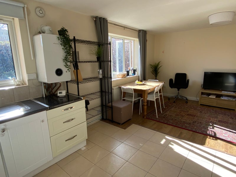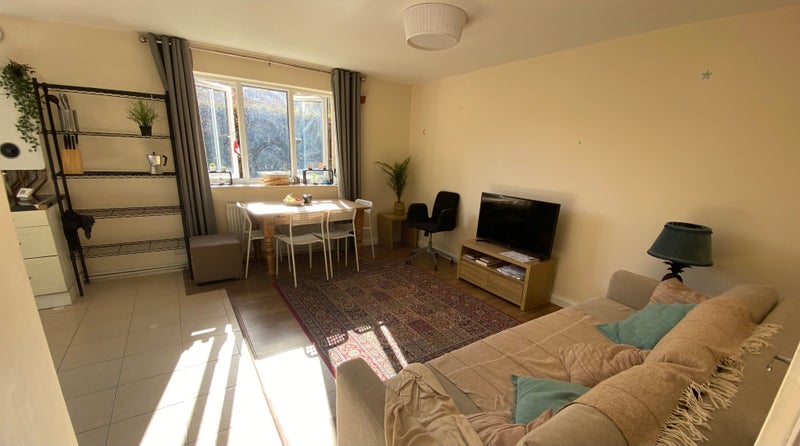 The flat is cosy (50 Sqm) and bright, easily accessible on the ground floor, with the privacy of all windows looking out onto the communal garden and bushes on either side. The flat is furnished, and there are 2 bedrooms, one larger and one small double; one bathroom with bath and shower, and an open plan lounge and kitchen.