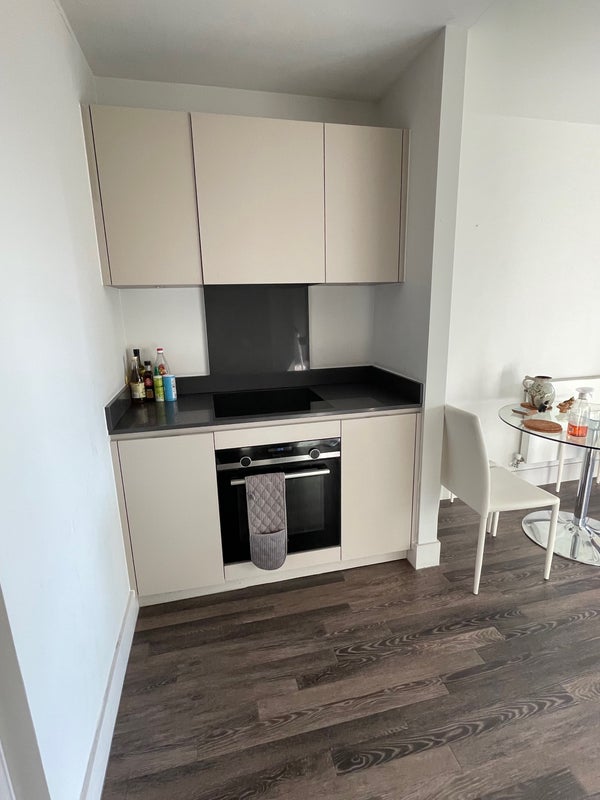 It’s a bright, modern one-bed with a really spacious open-plan kitchen and living area. The huge south-facing balcony is a real highlight and gets loads of sun — perfect for relaxing, working from home, or having friends over. The flat comes fully furnished, so it’s an easy move-in with everything you need already here.