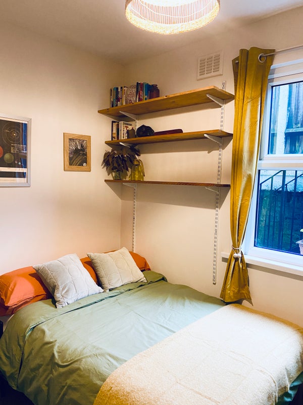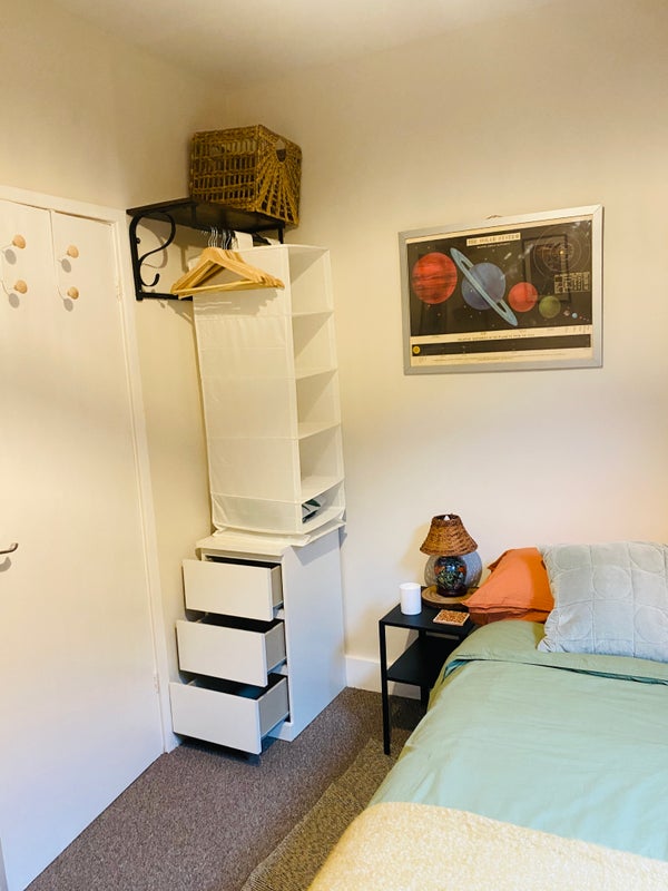 The room is a small double and has been recently decorated. It is quiet and furnished with a desk, bed and shelves. It has under-bed storage and an area for clothing etc