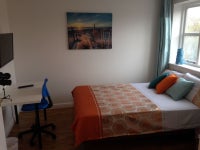 Wood laminate floor, double glazed window to front, wall heater and neutral decor. Double bed, wardrobe, chest of drawer, desk and chair.
