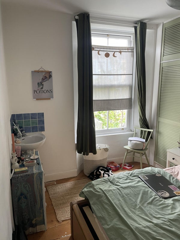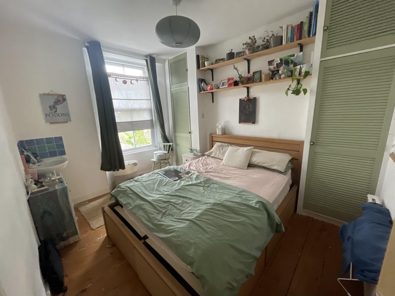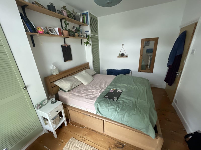 Light, airy upstairs double bedroom available from the 20th June. Lightly furnished (double bed with wardrobe and shelves, and blinds), but happy to add more/less furniture at your discretion.