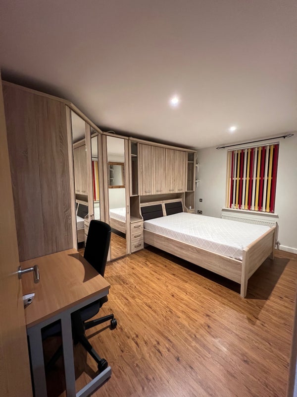 We have a fully furnished, double bedroom available for lodging, with access to a shared bathroom and communal living areas. The room is fully furnished with an integrated double bed and mattress, walk-in wardrobe with drawers and a desk.