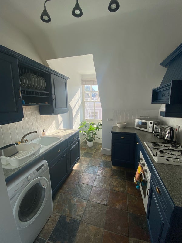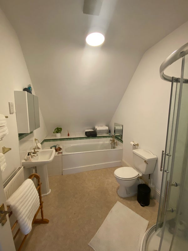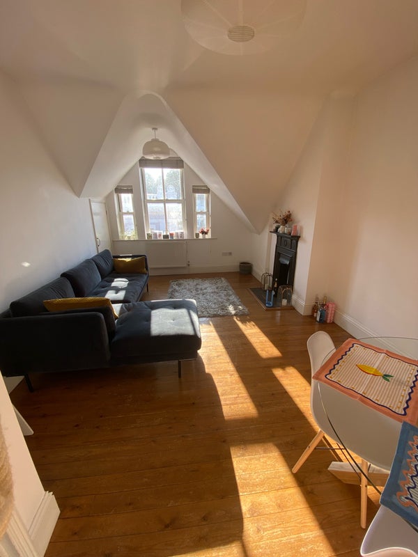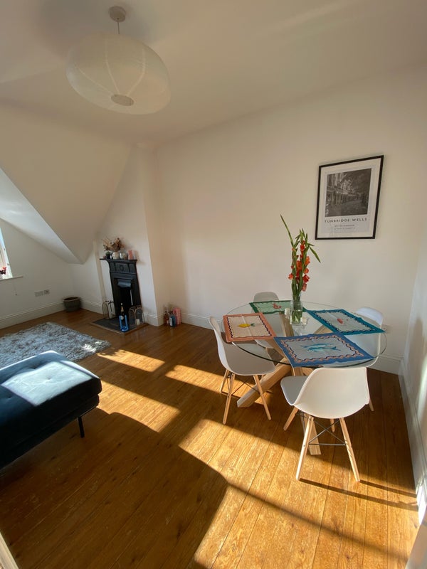 The flat is a hidden gem right on the high street. It's a 3-minute walk to the train station, very easy for commuters (~45 mins to London). It's a top-floor flat with very spacious shared living areas.