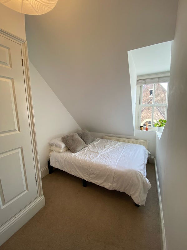 A light and spacious furnished (bed, mattress and built in wardrobe) double room with a comfy Emma mattress. Despite being on the high street, the bedroom is very quiet, looking over the church where Oakley Gym is located.