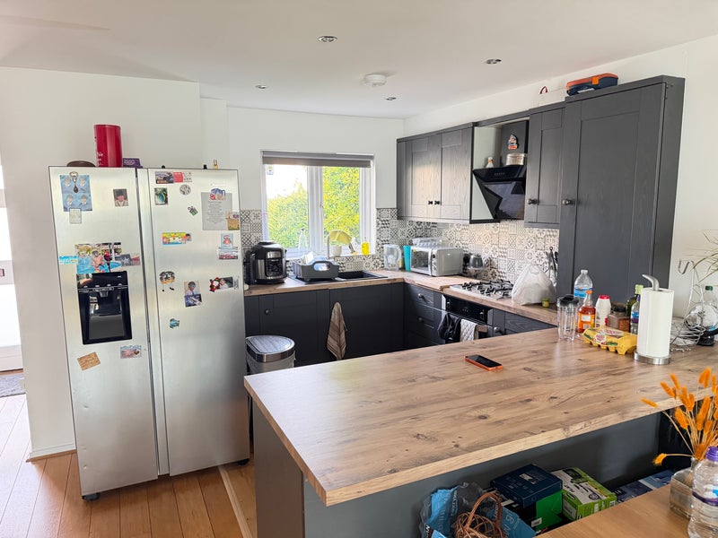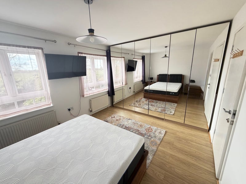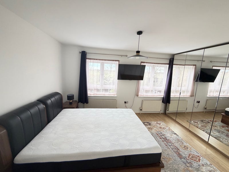 Spacious king-size en-suite room with a comfortable bed, large wardrobe, and plenty of bathroom storage. Enjoy free Wi-Fi, parking, access to a fully equipped kitchen (dishwasher, cooker, oven), washing machine, and a private garden with BBQ. Located 10 mins from Feltham Station, 30 mins to Waterloo Station, and 15 mins to Heathrow Airport.