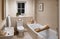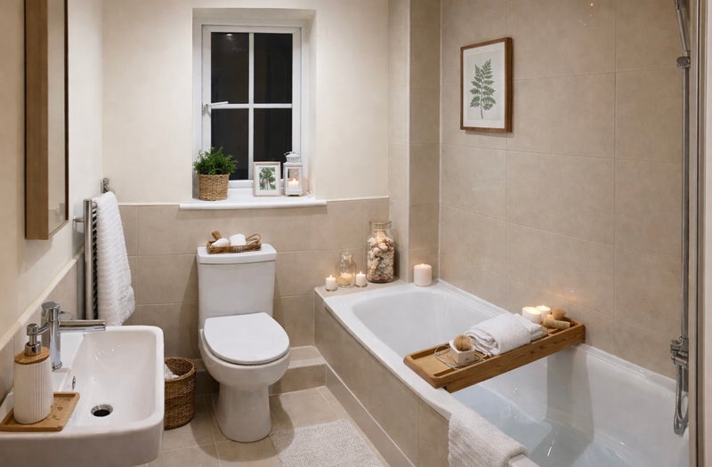 There is one bathroom with a bath tub and shower upstairs and one WC toilet downstairs.
