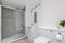 The kitchen is fully fitted with contemporary units and appliances. The bathroom is clean and well finished, including a shower, sink, toilet, towel rail, and mirror.