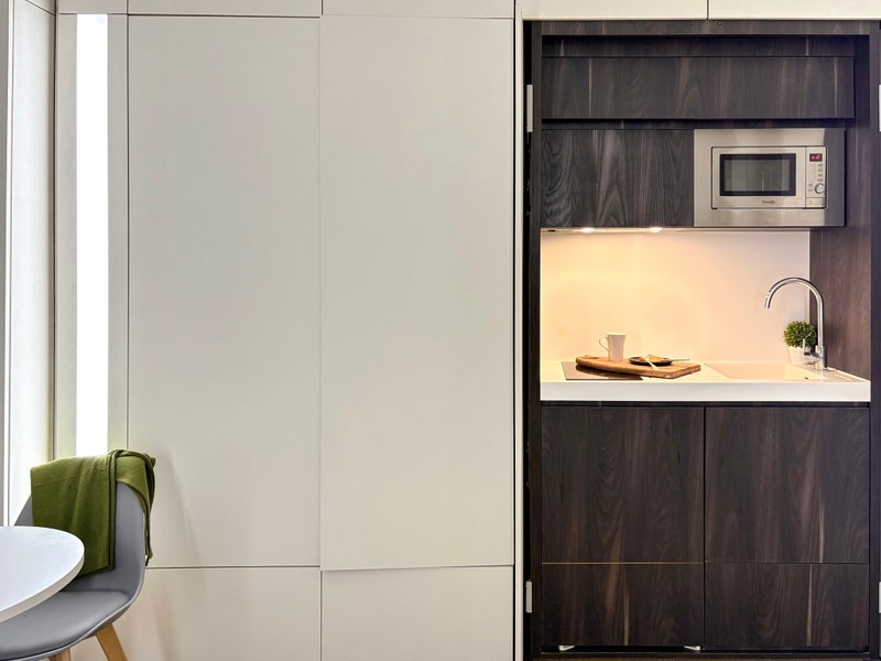- Compact kitchenette with double hob, fridge, sink and microwave