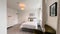 This spacious room has been thoughtfully crafted with working professionals in mind. It features a brand-new bed, 2 bedside tables, an armchair, a wardrobe, a chest of drawers, a dedicated desk and chair setup with an extra mirror door storage, ideal for anyone who works from home!