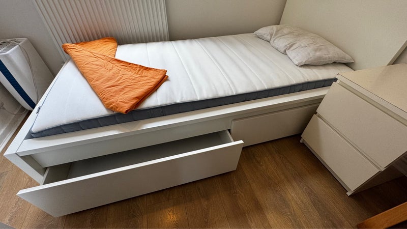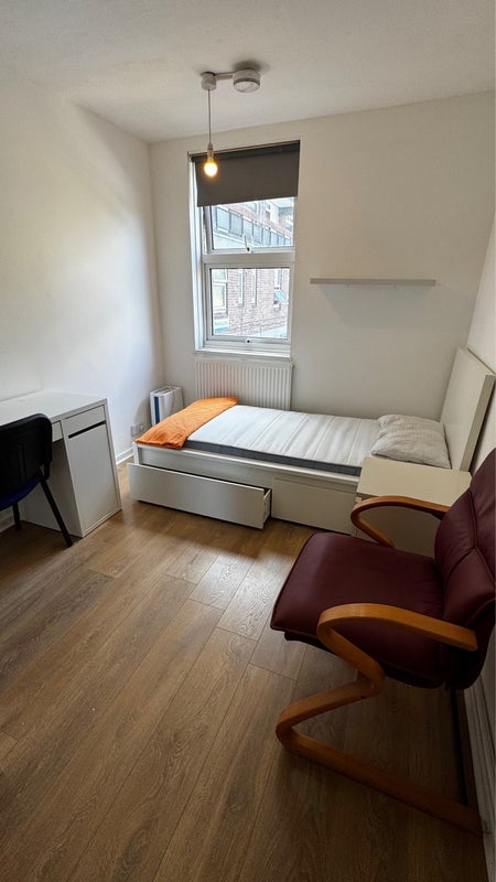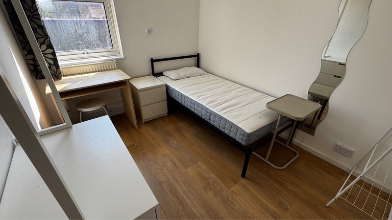 Room has a new Single bed, with extra hanger on top, a desk and a built-in wardrobe with another new chest of drawers.