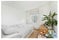 Well-lit, 2-bedroom flat split over the top two floors of a building. Top floor is airy living room with skylights, sofas, a dining table, and a little reading nook under a skylight. Bedrooms, bathroom, and kitchen are on the floor below, with modern amenities, a bath, and lovely big windows.