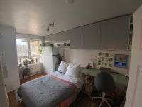 The double bedroom comes unfurnished apart from the inbuilt storage/cupboards. The room fits a double bed, desk and additional storage. If interested, all additional furniture displayed in the picture is for sale. That includes the bed frame, mattress, wardrobe, desk and chair. The rent is £775 + bills (Council Tax Band B).