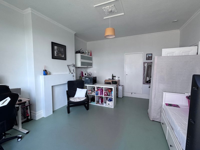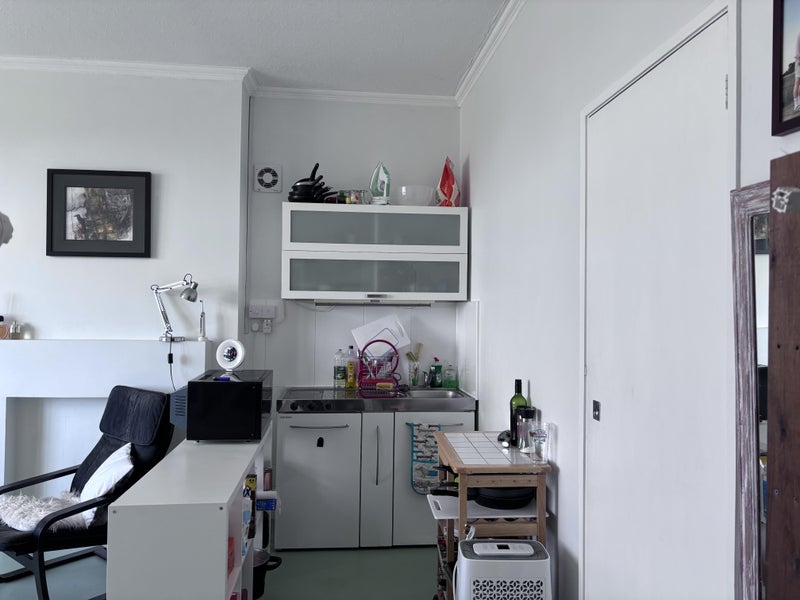 The room has a small kitchenette for cooking and an en-suite bathroom. It will have a double bed, desk and chair, shelving, and wardrobe. The front door and hallway is shared with the main house but once inside the room it is self contained. The main house is occupied by a professional couple, a friend and a friendly cat.